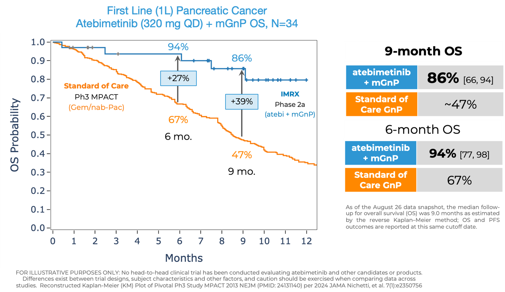 NEW YORK, Sept. 24, 2025 (GLOBE NEWSWIRE) -- Immuneering Corporation (Nasdaq: IMRX), a clinical-stage oncology company focused on keeping cancer patients alive, today announced positive updated survival and safety data from its ongoing Phase 2a trial of atebimetinib (IMM-1-104) in combination with modified gemcitabine/nab-paclitaxel (mGnP) in first-line pancreatic cancer patients (N=34), with 9 months median follow up. The data, to be presented at the Pancreatic Cancer Action Network (PanCAN) Scientific Summit 2025, marks a milestone for the Company in the treatment of one of the deadliest and most treatment-resistant solid tumors. The Company also announced it will not be hosting its previously scheduled conference call.