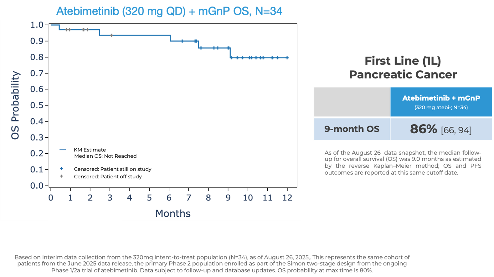 - Unless otherwise specified, all data are reported using a data cutoff date of August 26, 2025, from the same patient cohort (N=34) as previously reported in June 2025. The estimates of (and other references to) standard of care with respect to the nine-month follow-up data were extrapolated and reconstructed by the Company based on the publicly available third-party MPACT pivotal trial data for gemcitabine/nab-paclitaxel. The estimates of (and other references to) standard of care set forth above with respect to the six-month follow-up data were reported out directly from the publicly available third-party MPACT pivotal trial data for gemcitabine/nab-paclitaxel. The Company’s Phase 1/2a clinical trial of atebimetinib does not include a head-to-head comparison against any other agents, and caution should be exercised when comparing data across trials.