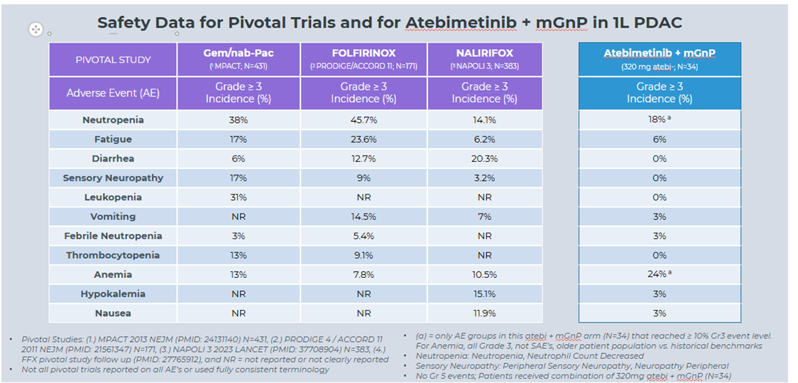 - As of the data cutoff date, Atebimetinib (320mg dosed once-daily) + mGnP continued to demonstrate a favorable tolerability profile in first-line pancreatic cancer patients (N=34), with only two categories of adverse events observed at the Grade 3 level in more than 10% of patients (neutropenia and anemia, both of which are categories commonly observed with standard of care chemotherapy). No new safety signals were identified.